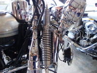 大人気のヘリテイジスプリンガーの特徴は、何といっても独特のフロントフォークにあります。2本のフォークを上下に動かしてフロントのスプリングで衝撃を緩和するという仕組みになってます。昔のものとは違い、オイルダンパーを装備するなど断然その性能はアップしています。また、スプリンガーフォークは、クラシカルな当時のハーレーを思わすデザインとなっています。パッシングライトを設けたライト回りや、革製サドルバッグ、ビンテージモデルを思わせるトゥームストーン(墓石)型のテールランプなどなどがより一層クラシカルな演出をしています。